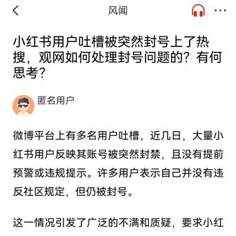 在#撩主编#版块中,有风闻读者提问:小红书用户吐槽被突然封号上了热搜